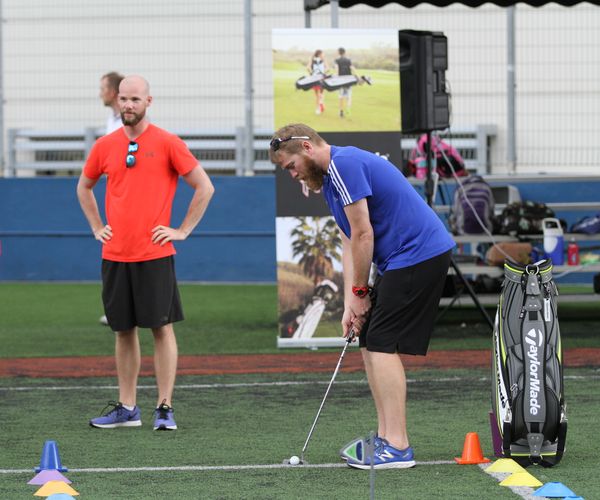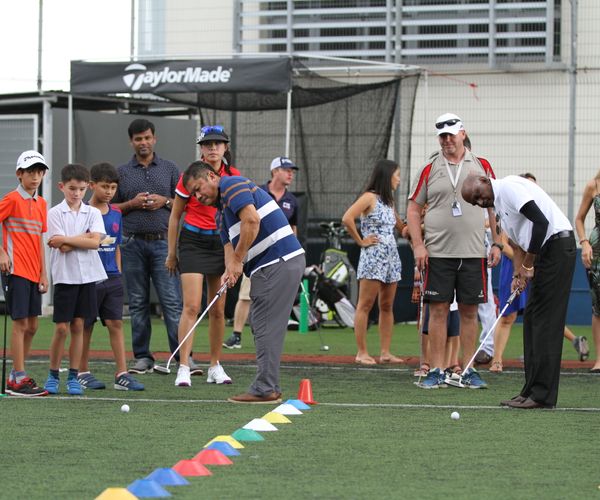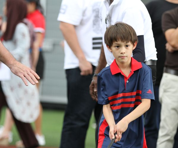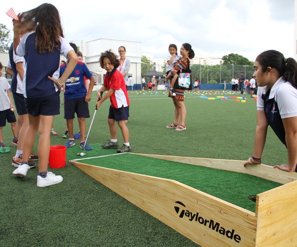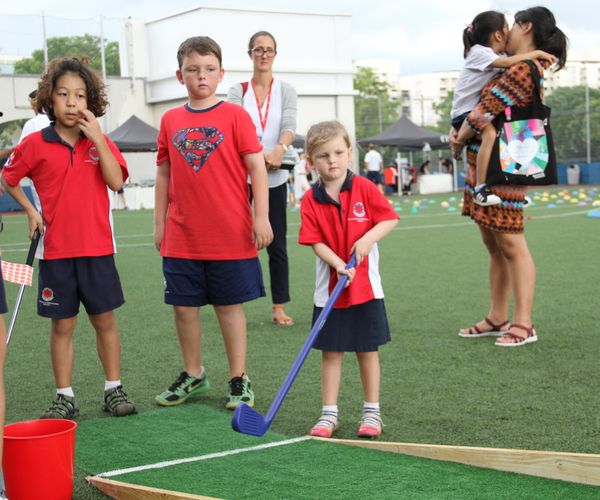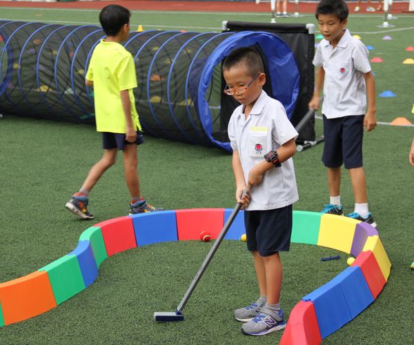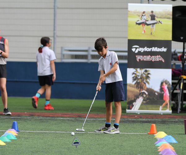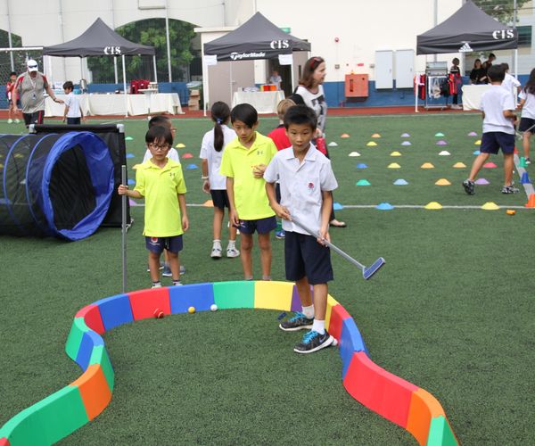 The open day started off with a longest putt competition from the pros and teachers. The kids and parents had fun on the many stations, suitable for all ages, which were set up around the sports field including a batting cage for performing full golf swings, mini putt games and putting greens. Students were challenged to putt the golf ball into the hole, and all tried very hard. CIS merchandise was awarded as prizes for all successful hole-in-ones on the putting greens. Putting stations were a big hit too, with prizes awarded on the Marina Bay, Canada and China themed holes. Players also had fun trying out a complete range of clubs provided by Taylor Made in our custom built on-campus CIS golf cage.