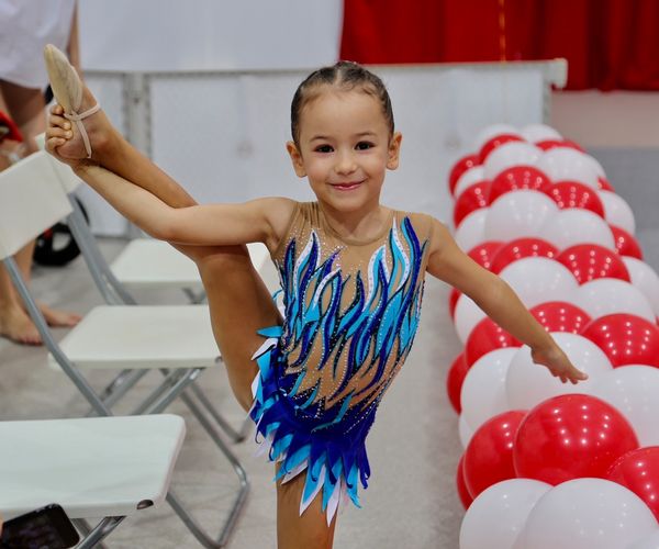 Rhythmic gymnastics is a sport that combines elements of ballet, gymnastics and dance. In order to be successful, rhythmic gymnasts must have balance, flexibility, coordination, and strength, and they must also be able to compete under intense pressure, and have the discipline and work ethic to practice. Aline only started rhythmic gymnastics about 6 months ago but she is already demonstrating many of these characteristics.