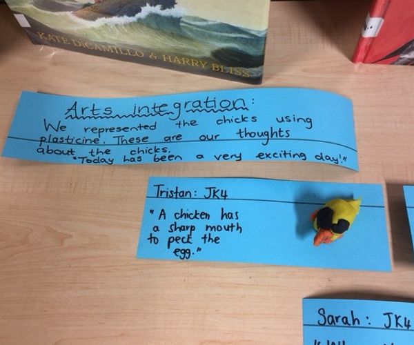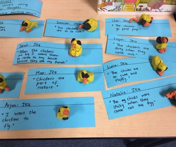 For two and a half weeks, the students observed the chickens grow and change. They recorded the changes they observed, created sculptures of the chicks with Sandra Ebsworth, our Integrated Arts Specialist, and wrote reflections on their learning with their homeroom teachers. The chickens quickly began to eat and drink from the dishes we had provided. They began growing wing feathers and becoming much more mobile. We had one escape which caused much panic and frightened peeping from the others until they were reunited. The children had the opportunity to touch them and observe them up close. They were even brought outside and given room to explore the Outdoor Discovery Centre.