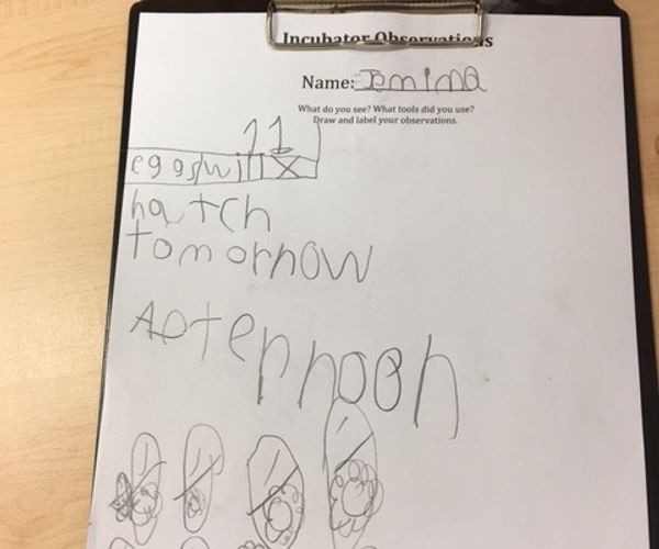 Using a large calendar, a countdown was initiated leading up to the hatching date at the end of a 21-day period. The students used their research skills to look up information in nonfiction texts. They used the features of a text to help guide them as they drew pictures, wrote information and shared their knowledge with each other. We used a powerful candling light that allowed us to have a look inside the eggs and see the development of the embryo.