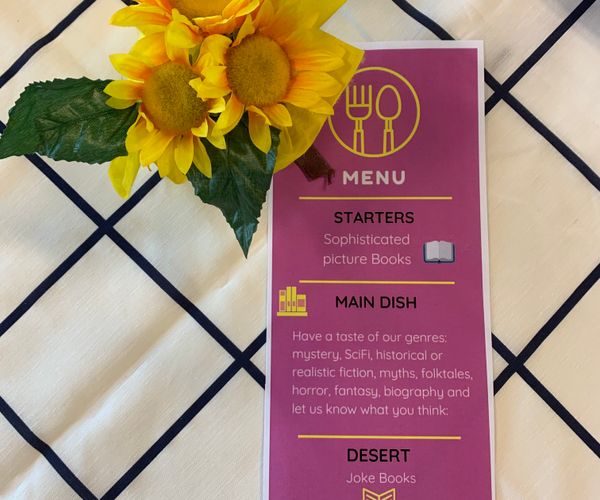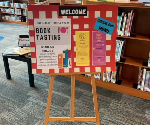 Grade 5 and 6s visited our “library bistro” where they had the opportunity to “taste” different book genres and leave a review.