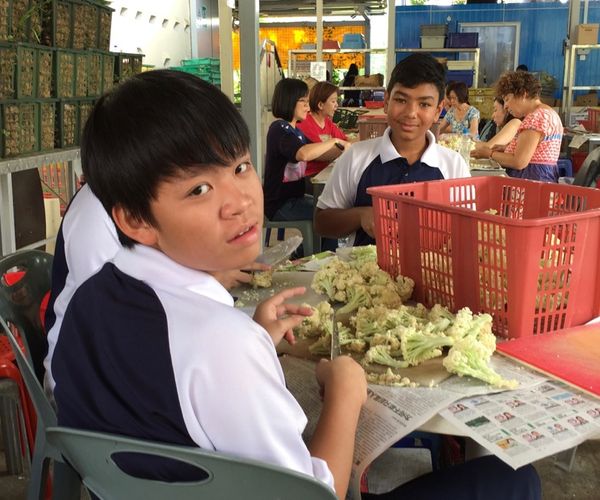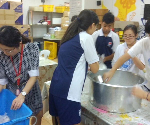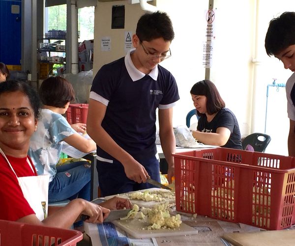 EMPATHY: The Willing Hearts kitchen serves five thousand meals a day to disadvantaged people around Singapore including the elderly, the disabled, low income families, children from single parent families (or otherwise poverty stricken families), and migrant workers in Singapore. It is a well-organised service supported by an army of volunteers across the island. We were part of this group for a morning! Vegetable chopping, pouring milk from cartons into containers, putting sugar into bags for distribution to people and moving fifty kilogram bags of rice for the next day’s cooking were our tasks. It was an enlightening experience to see such a huge kitchen providing and distributing food to so many people.