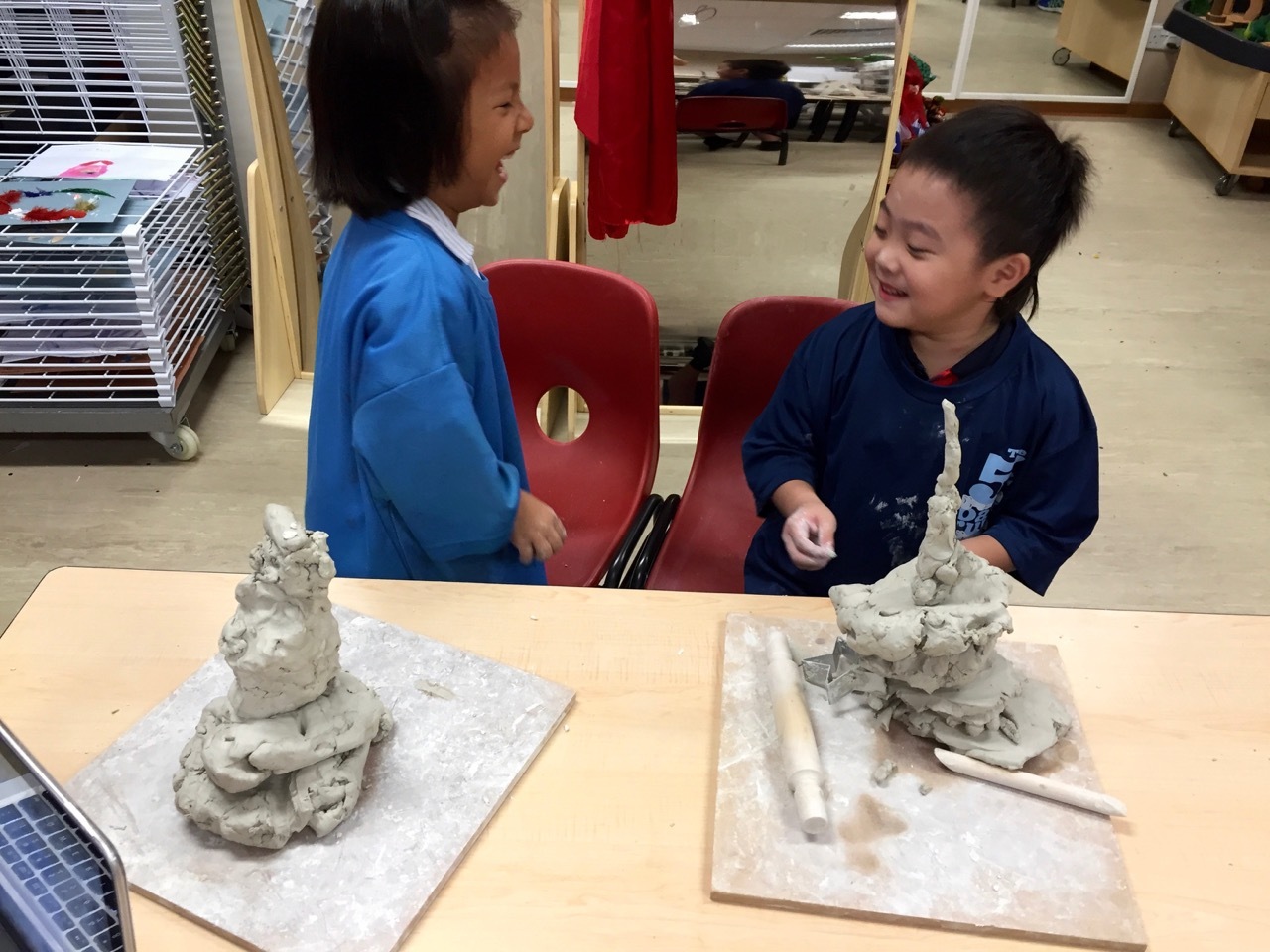 Our students use these ‘languages’ to demonstrate their ideas, while simultaneously demonstrating to their teachers their thinking process and decision making rationale. Initially, children are presented with a range of materials (paint, cloth, wooden blocks, clay, and so on). They are encouraged to explore and investigate ways to use these materials in ways that represent their thinking, and conceptualised ideas. Teachers are nearby, and assist students’ thinking by demonstrating techniques on how to use the materials, and talking about what creations might be possible.