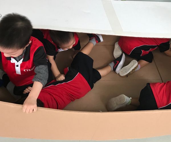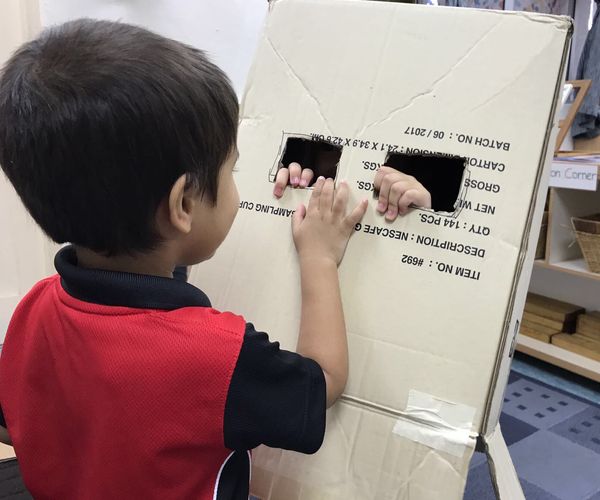 Students explored and played with boxes after reading about how a rabbit has a box, which creatively transforms into a car, building and a rocket amongst other things. The children are learning to use their imagination, cooperation and communication skills as they play with boxes and share what they think the box could be. “It is not a box. It is a bed, an aeroplane, a blanket, a house, a boat and more!”