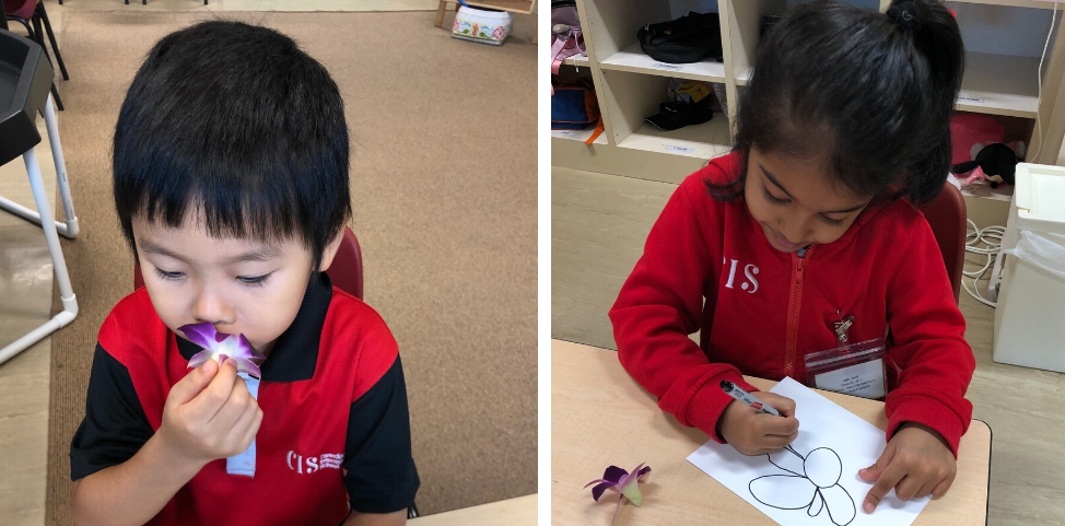 This engagement not only helped the students develop their observation skills and reflect on what they saw, it also brought up topics for discussion. Through noticing the details, the children’s understandings deepened, and provoked further questions and statements. Some of their wonderings were: “Why does an orchid have different shapes?”, “I can see the pollen in the orchid.”