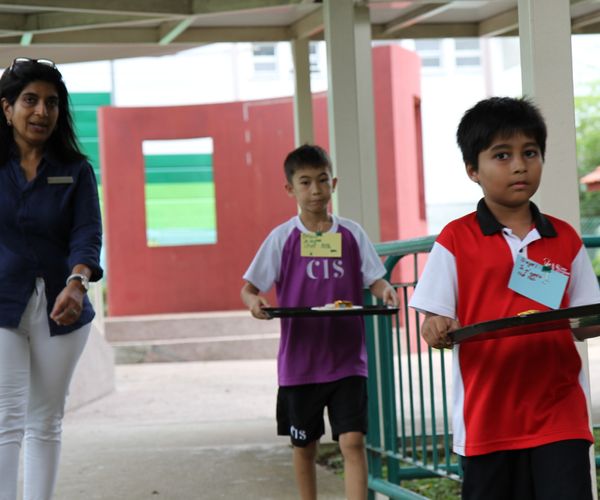 Menu cards, carefully written by the grade 3s, served as table mats. Since their biggest concern was that mum or dad didn’t speak French, there were pictures to explain the ingredients. And of course, not forgetting the “bill” that was presented at the end of the meal where real money was collected and counted. Everyone had a good lunch at the TK MYP basketball court and we are very thankful to all the “customers” who took time from their busy schedules to come join us for lunch.