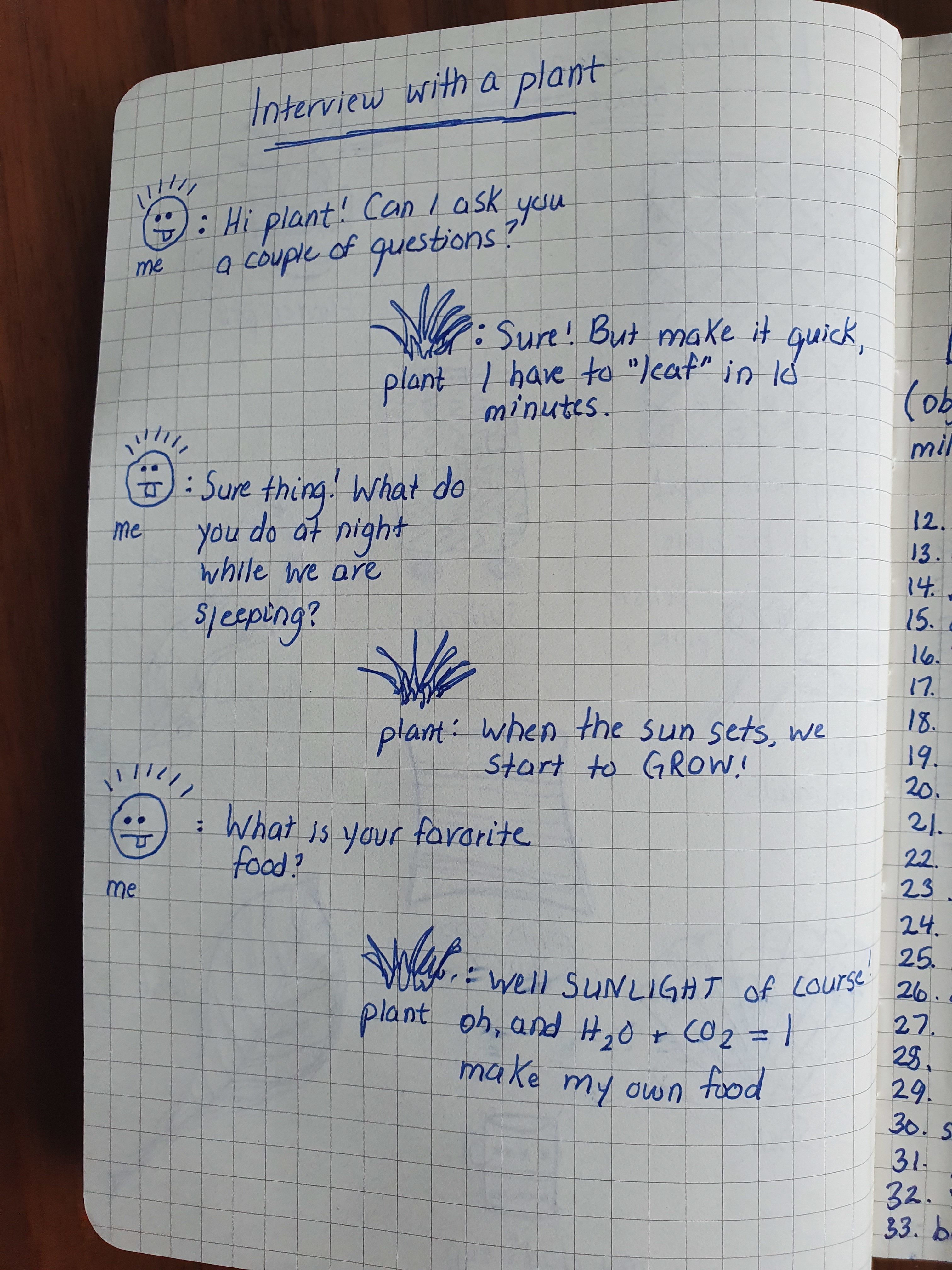 Get your child to choose an object from your home or garden to interview. It could be their shoes, a plant or Dad’s smelly socks….. Ask them to write down what questions they would ask their chosen object and how they think it would then reply.