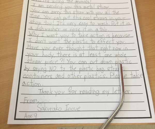 For one of my students, Fantine Spoor, the reason to stop using plastic straws was even more compelling. She said, “I don’t want my baby sister to eat fish that already has chemicals and plastic in it - that’s what is happening to the sea life in the oceans. We need to stop putting plastic into the oceans. No one needs to use a plastic straw again.”