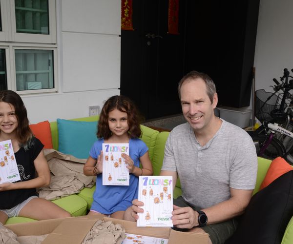The seven lions’ stories started on a family holiday in Japan. I told them to Olivia and Samantha (grade 4) on train journeys to help stave off the boredom and after every silly story I told them, they would insist I tell them more. On a business trip to London, I re-told a couple of stories to my niece and nephew who live there, and they told them the next day to their friends at school who liked them and insisted on hearing more. On hearing this, my brother-in-law suggested we turn the stories into books, which we are now doing.