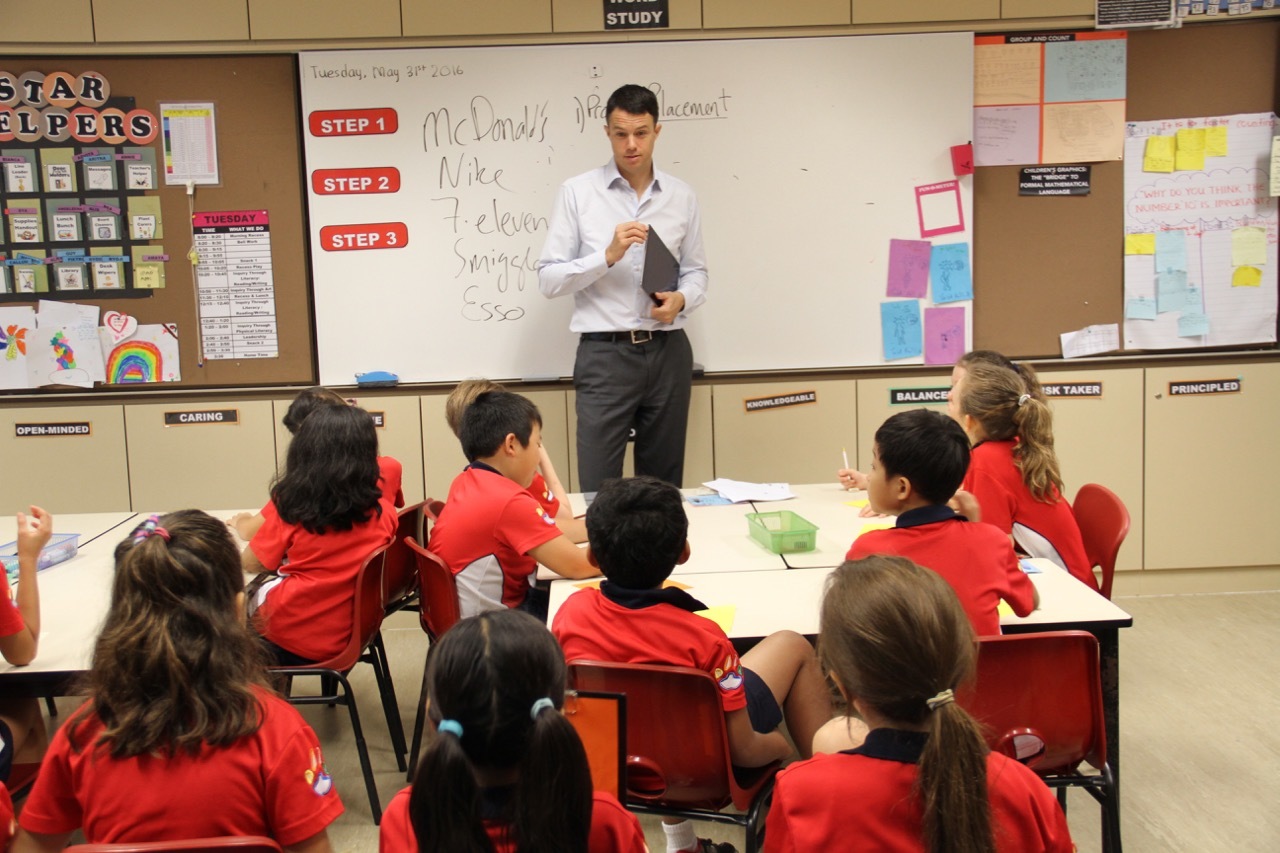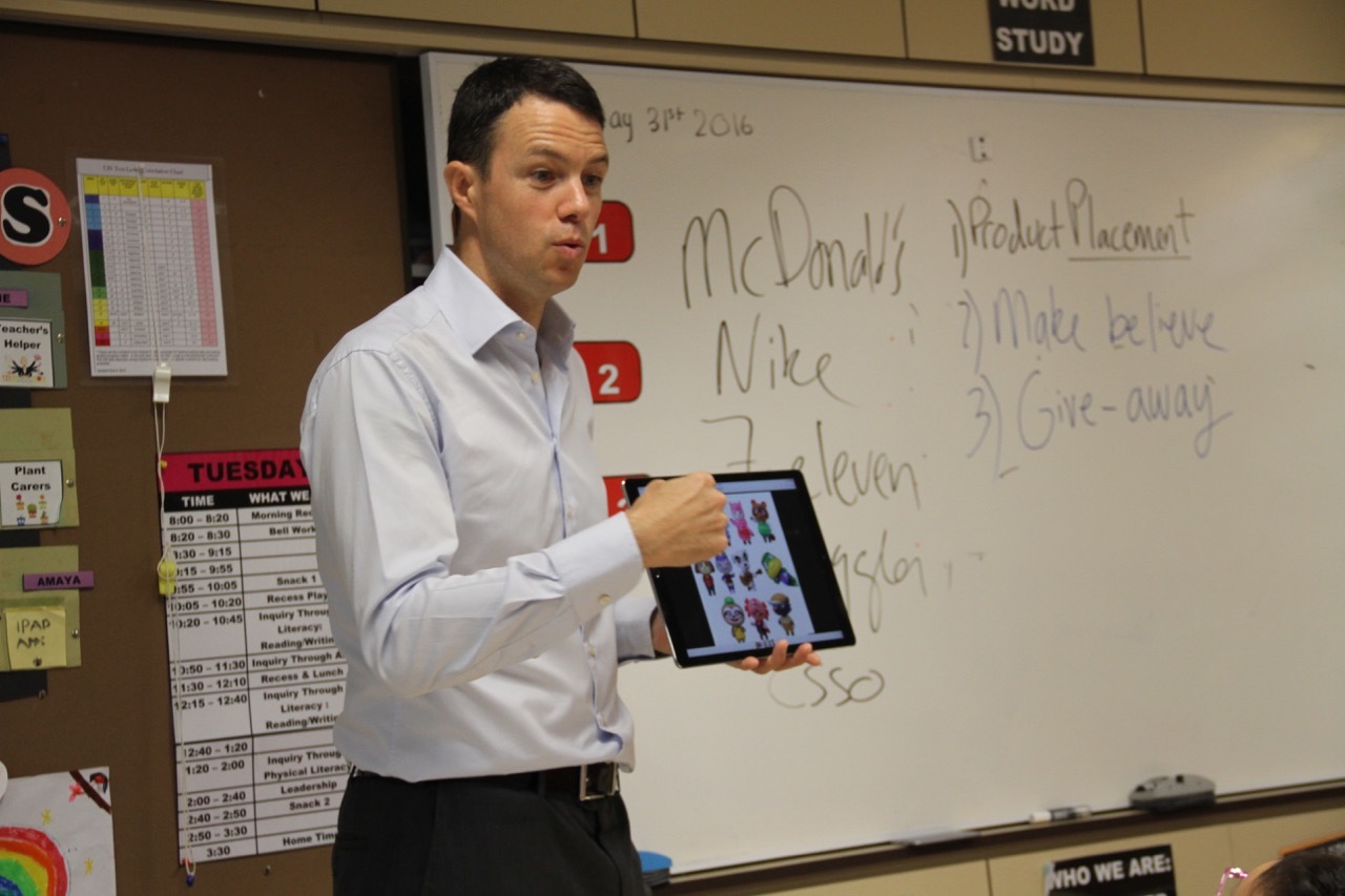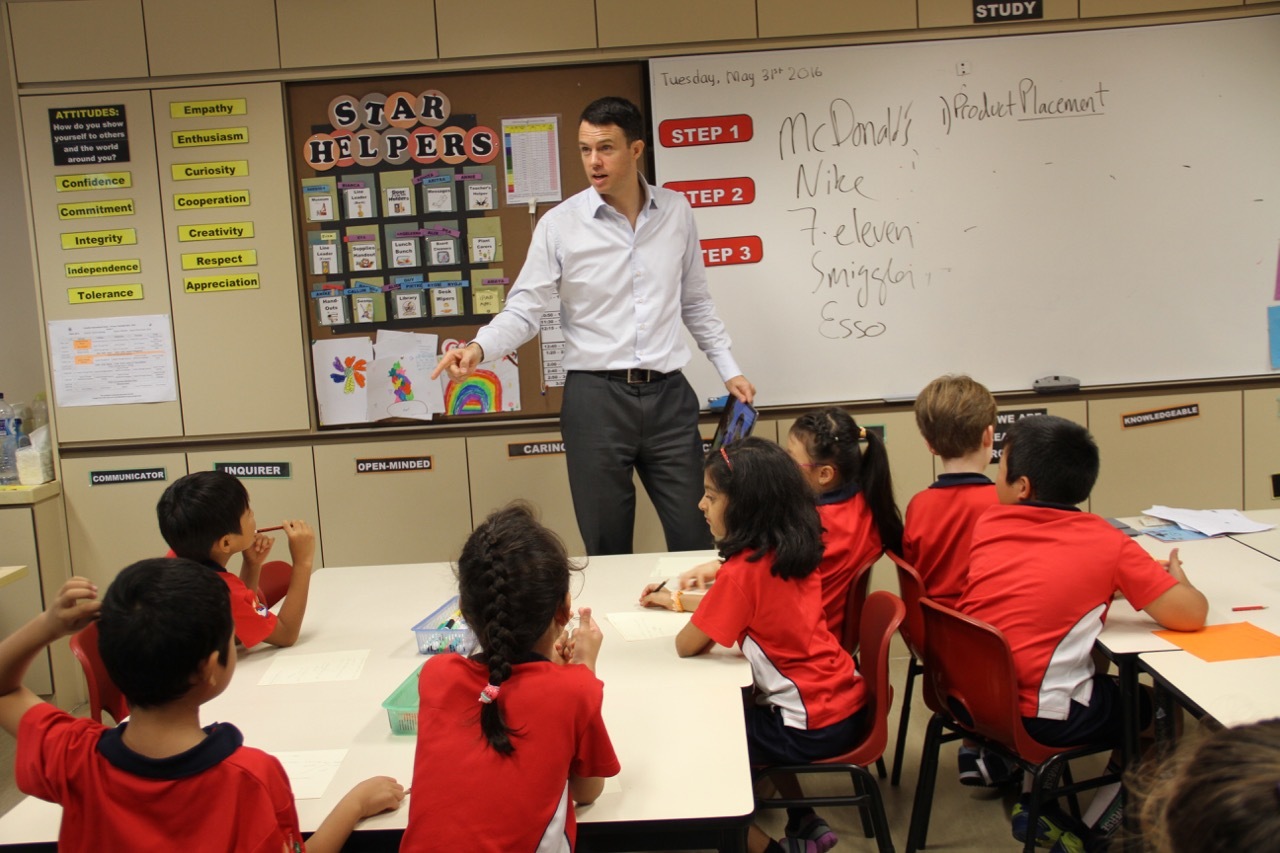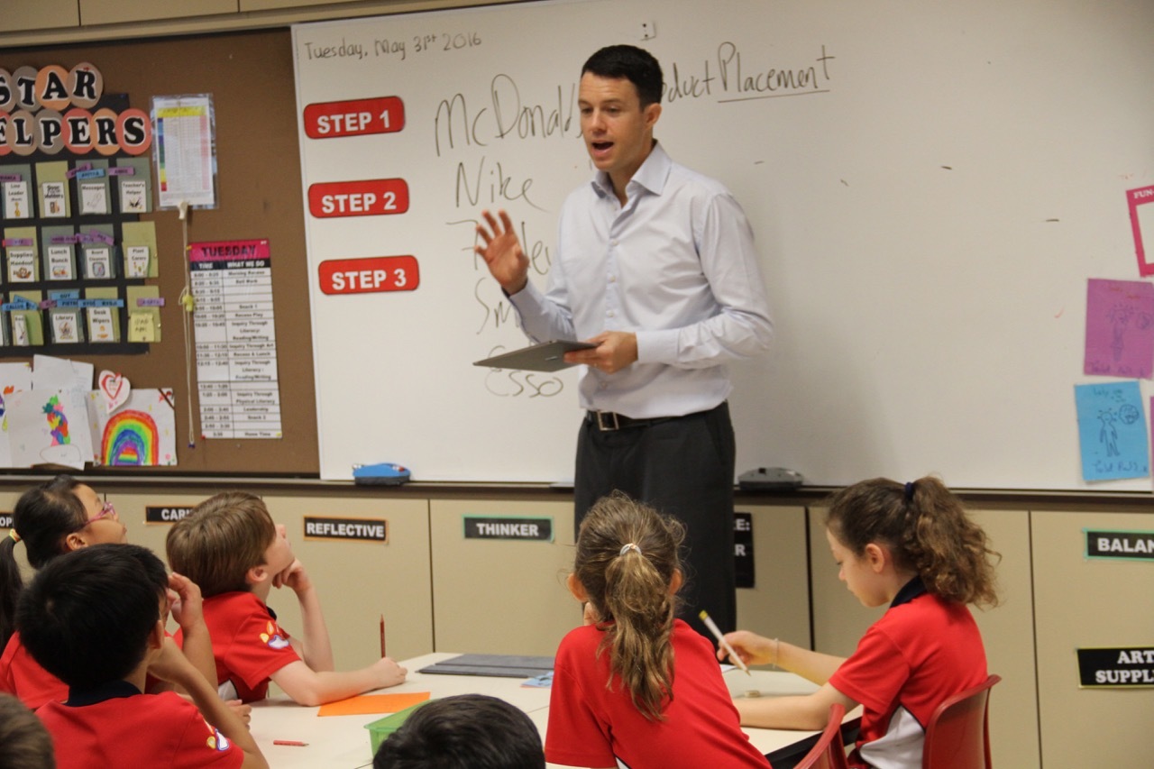 “How do companies appeal to consumers?” was the first question Mr. Blatter posed to the class. The answer was simple: by getting to know consumers’ needs and wants and becoming their “friend”. This answer sparked a flurry of excited talk as students connected a previous learning task to Mr. Blatter’s topic. Class 2-3 students previously designed and conducted surveys on Grade 2 homeroom classes about people’s interests so that they could use the data to design products in the Primary MakerSpace. As Mr. Blatter introduced how advertisers seek to become people’s “friends’, students realised that there is much more that goes on behind the images and phrases of ads, posters and commercials.